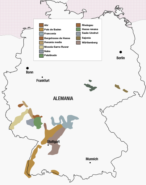 Las regiones más famosas se extienden a lo largo del Rin y de sus afluentes Mosela, Nahe, Neckar y Main, con los viñedos ubicados en laderas. Destacan las siguientes regiones